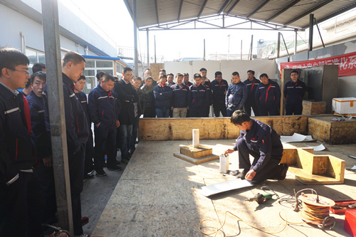 下昼 ,《单程防水卷材屋面工程手艺规程》及《TPO事业部施工流程梳理及质料治理》的宣贯 ,让与会职员明确掌握了工程手艺及施工历程中的规章制度 ,项目司理组和工人代表组也就项目治理的履历与施工手艺作了分享 ,新同事们如获至宝 ,现场提问、讨论同步举行。   颁奖环节 ,现场为TPO事业部优异项目司理王海东、崔岩 ,优异施工班组张广志 ,优异施工员李冰 ,优异新人钟鱼 ,优异施工队长高明坤等人揭晓奖励及证书。   本次培训还组织TPO细部节点实操大赛 ,由2015中国屋面防水巨匠徐龙潇现场演示阴阳角和管根的标准化施工实操及解说。TPO事业部的所有施工治理职员及班组组长全神贯注寓目 ,字斟句酌的施工工法引来阵阵赞叹。